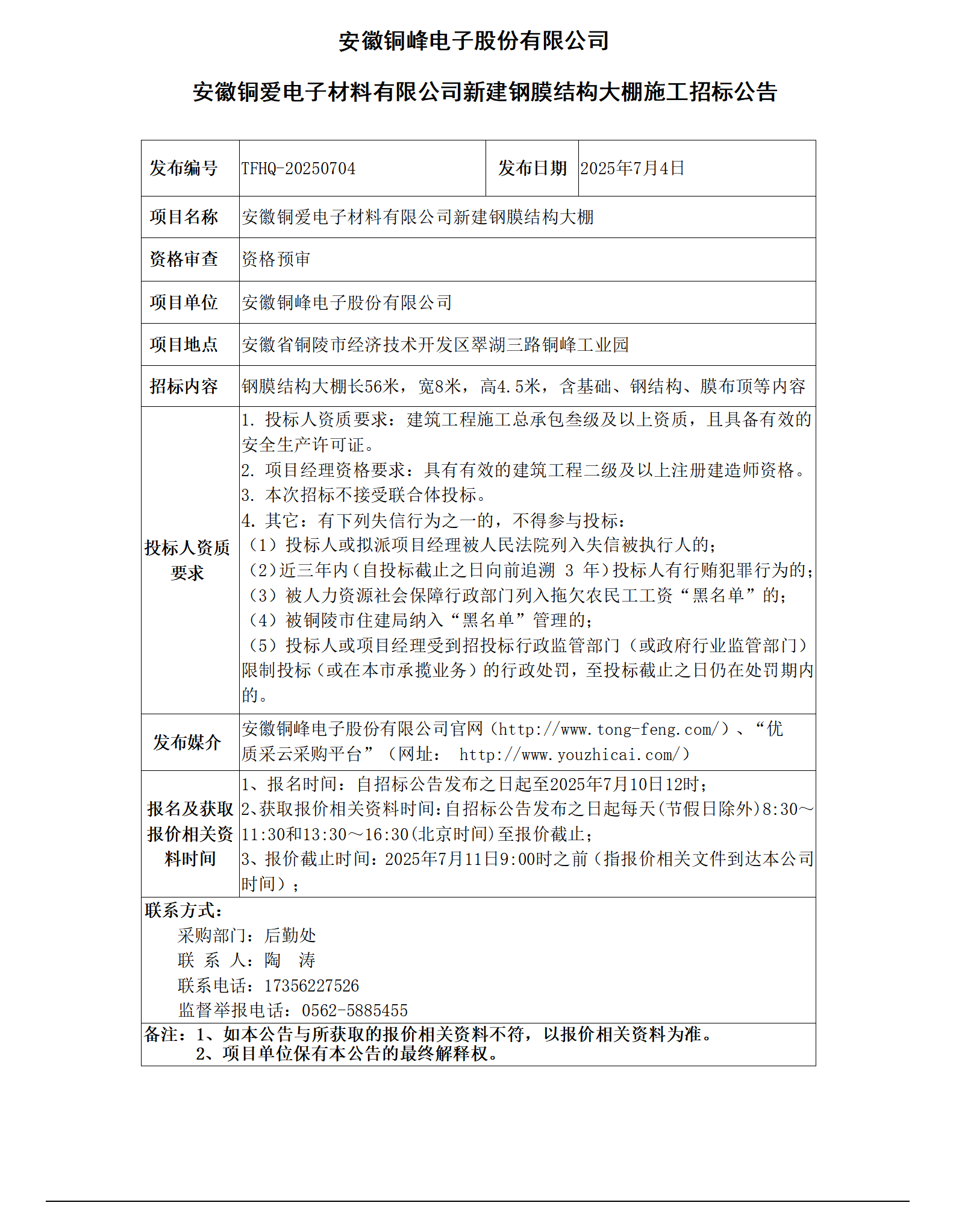 william威廉中文官网 (安徽铜爱电子材料有限公司新建钢膜结构大棚招标公告)_01