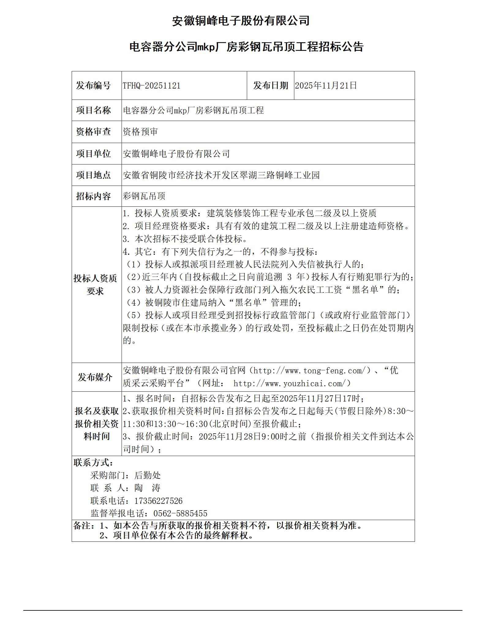 william威廉中文官网 (电容器分公司mkp厂房彩钢瓦吊顶工程 招标公告)_01