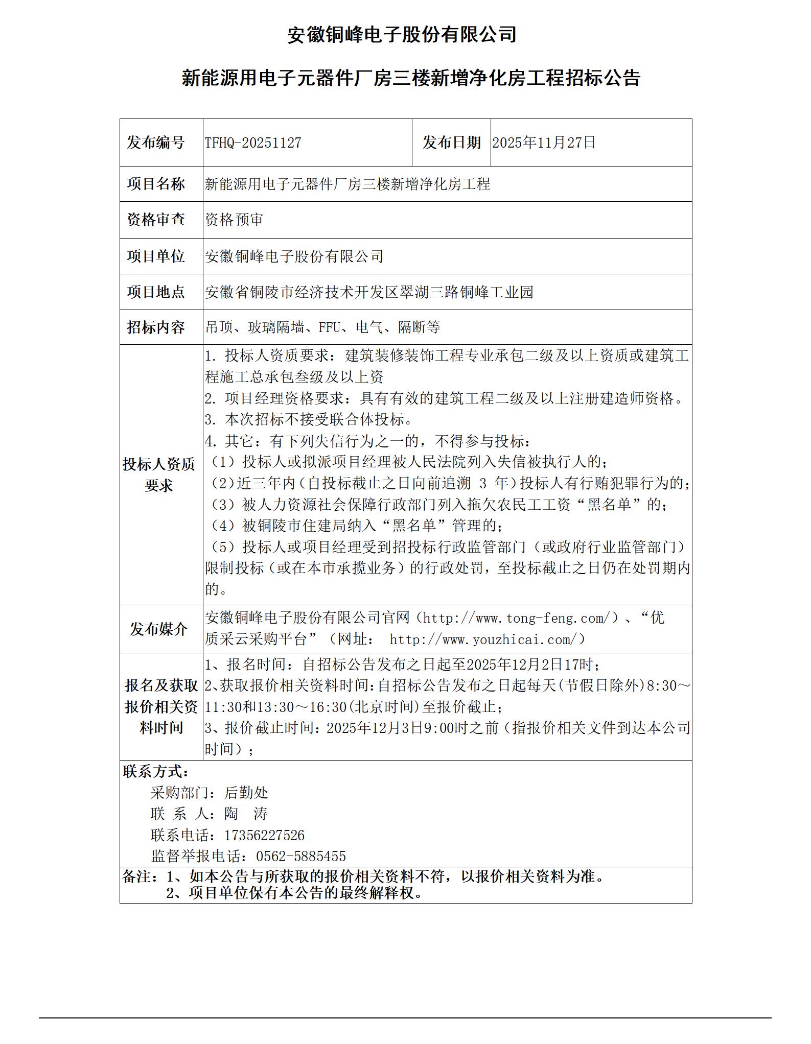 01william威廉中文官网 (新能源用电子元器件厂房三楼新增净化房工程 招标公告)_01