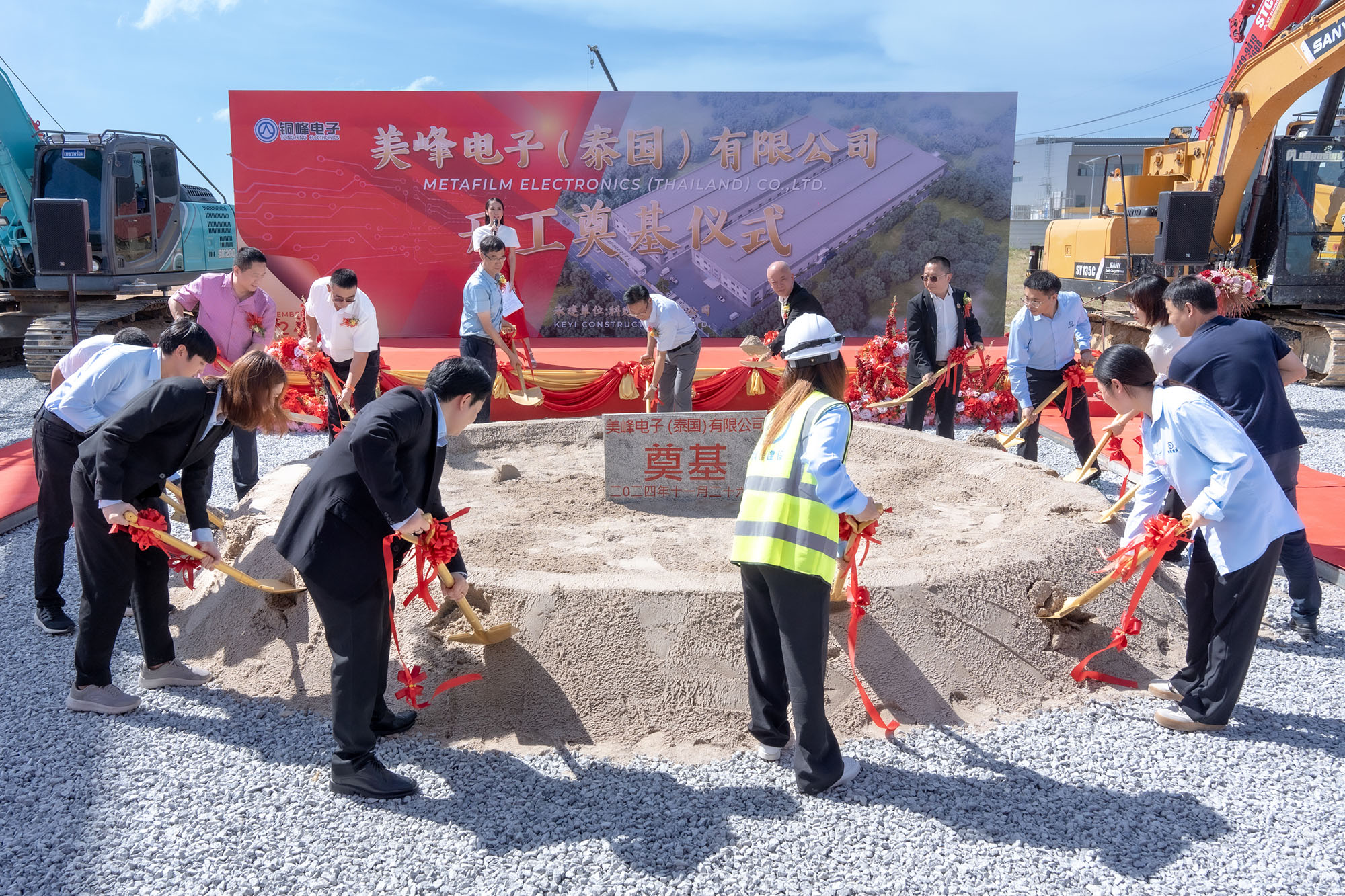11月26日,美峰电子(泰国)有限公司开工奠基仪式在泰国罗勇府伟华工业园隆重举行。公司党委副书记潘世宇,泰中工商联合总商会主席林伟,伟华工业园、泰国网传媒有限公司、美峰电子、项目施工单位负责人等共同见证这一盛事。